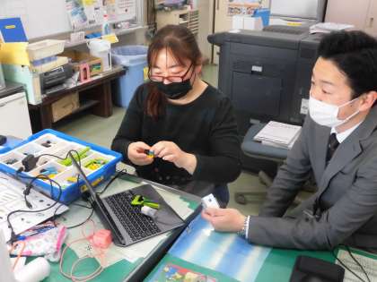 私も、プログラミングに挑戦してみました。レゴブロックとタブレットを使って、扇風機を作ってみました。面白いのは、扇風機の羽の回る速さを変えることができたり、タブレットの指示を通して、音も鳴ったりするんですよ。ぜひ、楽しいので、学校が再開したら、チャレンジしてみましょうね。