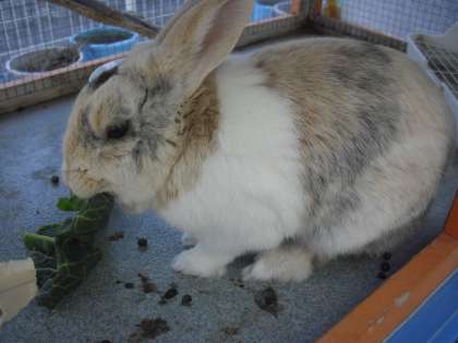 このウサギは、校庭にいる「チョコ」ちゃん(オス)です。写真をとった時に、ちょうど主事さんからキャベツの葉をもらい、ムシャムシャとおいしそうに食べていました。学校が再開したら、声をかけてあげてくださいね。ちなみに、校庭にはカメもいます。名前は「ノコノコ」です。こちらも元気です。