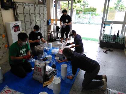 16日(土)に、等々力小おやじの会のみなさんが集まり、「ミニひまわりプロジェクト2020亅のために準備をしてくださいました。