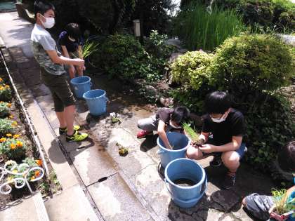 また、ビオトープギルドの小沢さんと遠山さんをお招きして、バケツ稲の田植えを教わり、取り組みました。