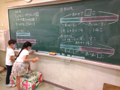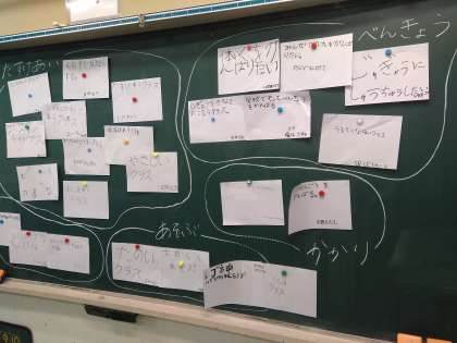 一人一人が考えたクラス目標を黒板に掲示し、仲間分けしたり繋げたりとより良いクラスを目指します。