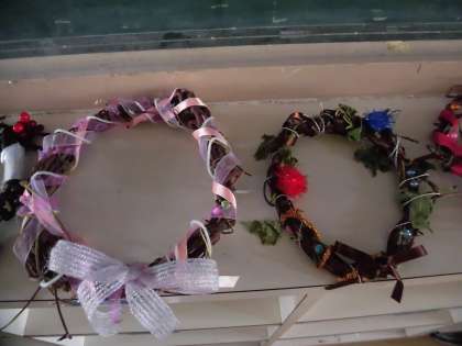 リボンを巻いたり、ビーズをつけたりして、色鮮やかなリースができあがりました。
