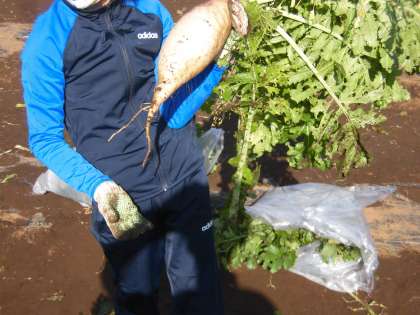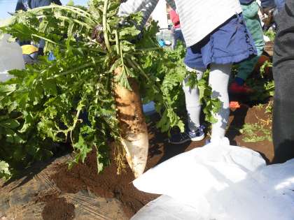 11月26日、3年生は大根ほりに行きました。5kg程あるとても大きな大根を、クラスの仲間たちで協力してなんと140本近く抜きました。帰り道、必死にかかえながら歩く姿が、とてもかっこよかったです。