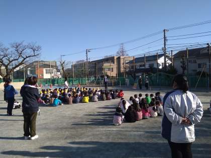 1月14日に避難訓練を新BOPと合同で行いました。1年生は初めて校庭まで出て集まりました。校長先生のお話をきく態度が立派でした。