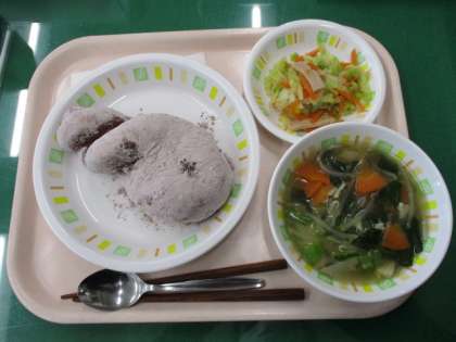 2日目のメニューはあげパン(ココア)、ワンタンスープ、キャベツの中華サラダ、牛乳でした。あげパンは子どもたちに人気のメニューです。