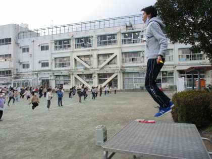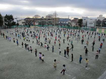 1・2・3年生は1月18日(月)に体育朝会で縄跳びを行いました。両足跳び、けんけん跳び、かけ足跳びなどを練習したあとは、ポニョの曲に合わせてリズム縄跳びに挑戦しました。子どもたちは寒い中、一生懸命に跳んでいました。