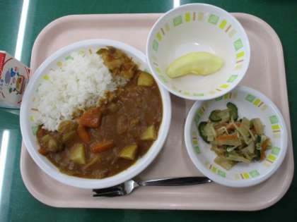 今日の給食は、チキンカレーライス、福神漬、こんにゃくサラダ、りんご、牛乳です。今日はカレーの日です。昭和57年に全国学校栄養士協議会が、1月22の給食のメニューをカレーにすることを決め、全国の小中学校で一斉にカレーが出されたことにちなんで定められました。
