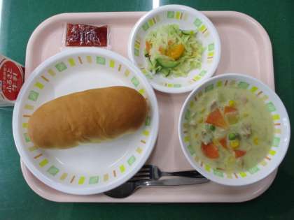 今日の給食はコッペパン、いちごジャム、クリームスープ、フレンチサラダ、牛乳です。今日は昭和25年ごろの給食を再現しました。コッペパンにジャムというシンプルな組み合わせですが、子どもたちには意外と人気があるメニューです。