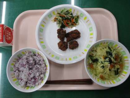 今日の給食は、ゆかりごはん、くじらの竜田揚げ、野菜のからしじょうゆかけ、かきたま汁、牛乳です。昔の献立を再現した給食、最終日はくじらの登場です。くじらは独特の味や香りがありますが、子どもたちにはとても人気がありました。