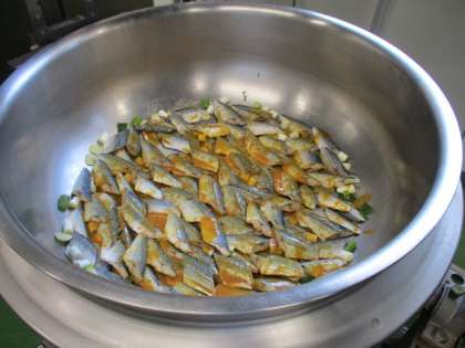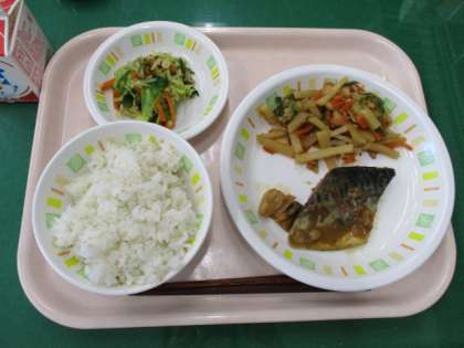 今日の給食は、麦ごはん、さばのみそ煮、じゃがいものきんぴら、のり酢あえ、牛乳です。さばのみそ煮は、大きな釜で約2時間煮たので、味がよくしみています。