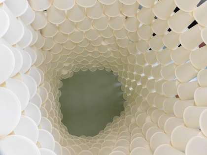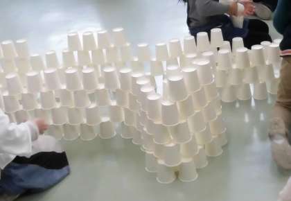 最初は、一人もくもくと紙コップを積み重ねていた児童が、もっと高く積むために仲間を集め、最後にはクラス全員で迷路を作る活動に広がっていきました。