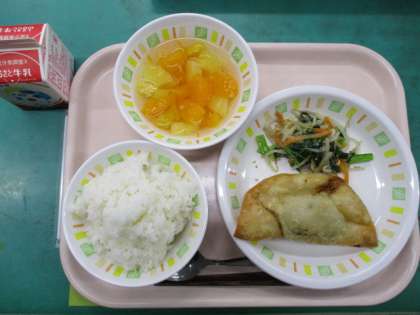 今日の給食は、ごはん、ジャンボぎょうざ、塩ナムル、フルーツポンチ、牛乳です。今日のメニューは、6年2組のリクエスト献立です。卒業前にもう一度食べたい献立を、6年生が家庭科の授業で考えてくれました。ジャンボ餃子は、どの学年からも大人気です。