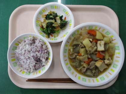 今日の給食は、ゆかりごはん、五目うま煮、野菜のおかかかけ、牛乳です。五目うま煮の味つけには、しょうゆと砂糖のほかに味噌も使っているので、コクのある味に仕上がりました。煮物が苦手な子もいますが、今日は残りも少なく、よく食べていました。
