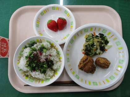 今日の給食は、梅茶づけ、鶏肉の唐揚げ、わかめサラダ、いちご、牛乳です。今日は6年3組のリクエスト給食です。お茶漬けは、毎年リクエストであがってくる意外な人気メニューです。カリカリ梅やゆかりを混ぜたふりかけに、昆布茶を使っただし汁をかけていただきます。