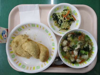 今日の給食は、あげパン、豆腐団子と春雨のスープ、わかめとキャベツのサラダ、牛乳です。スープには、鶏ひき肉に豆腐を混ぜた肉団子が入っています。豆腐が入ることで、ヘルシーでふわふわした食感になります。