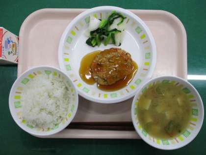 今日の給食は、ごはん、豆腐入りさくさくハンバーグ、かぶのレモンじょうゆかけ、あおさのみそ汁、牛乳です。豆腐入りさくさくハンバーグには、1センチ角に切ったれんこんを入れて、歯ごたえを残しました。ほかにもこんにゃくなどが入っていて、ヘルシーなハンバーグです。