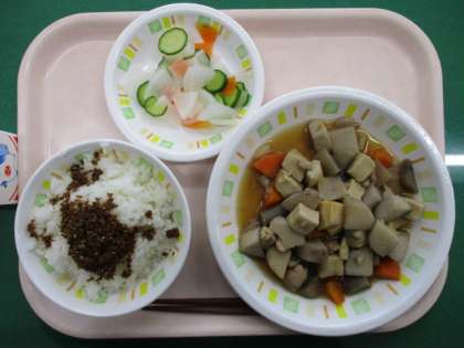 3月10日の給食は、ごはん、とり肉と里芋のうま煮、かつおでんぶ、大根の甘酢かけ、牛乳です。かつおでんぶは、今月の給食だよりにレシピが載っていますので、ぜひご覧ください。