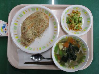 今日の給食は、あげパン、ワンタンスープ、春野菜の中華サラダ、牛乳です。子どもたちから人気のあげパン。教室では、おかわりをめぐってじゃんけんが行われていました。