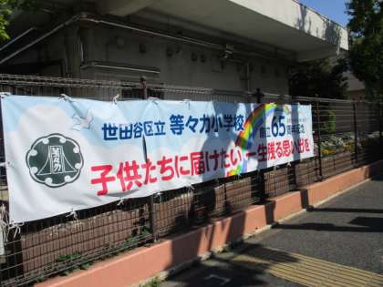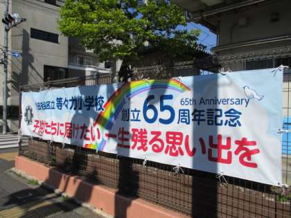 等々力小学校は今年開校65周年を迎えました。記念の取組として、正門横のフェンスに横断幕を設置しました。開校65周年のこの年を、子供たちの心に残る年にしたいとうメッセージを込めています。ご来校の際にご覧ください。
