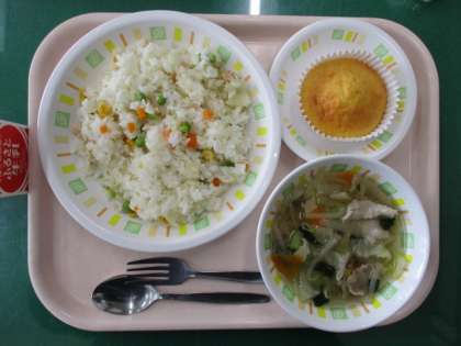 今日の給食は、鮭ピラフ、ベーコンと野菜のスープ煮、手作りマドレーヌ、牛乳です。学校給食では、ゼリーやカップケーキなど、デザートもすべて手作りです。バターと卵の香りがする、おいしいマドレーヌです。