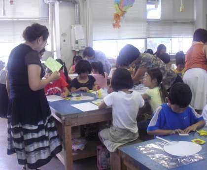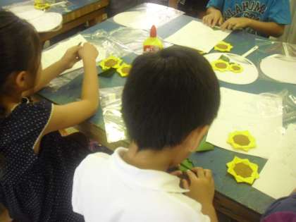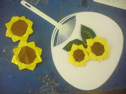 折り紙で「ひまわり」の花を作りました。葉っぱも折り紙で折りました。できあがったひまわりをうちわにはって完成です。暑い夏に涼やかな風を運んでくれることでしょう。