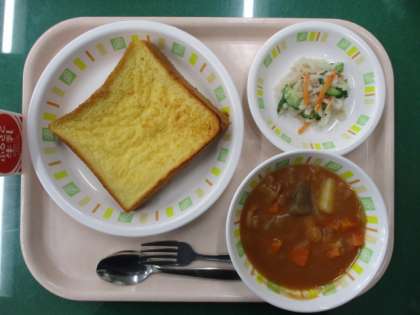 今日の給食は、フレンチトースト、ビーンズシチュー、大根とツナのサラダ、牛乳です。フレンチトーストは、バニラオイルで香りづけをした卵液をたっぷりしみこませてオーブンで焼きました。やさしい甘さが子どもたちに人気です。