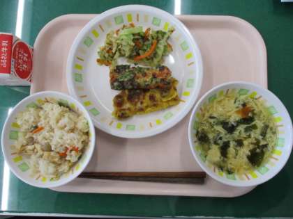 今日の給食は、山菜おこわ、ちくわの二色揚げ、のり酢あえ、かきたま汁、牛乳です。春に美味しい山菜を、おこわにしました。もち米が入っているので、もちもちした食感でおいしくいただきました。
