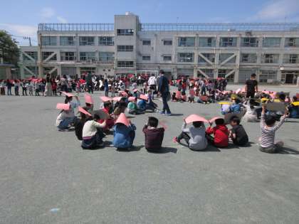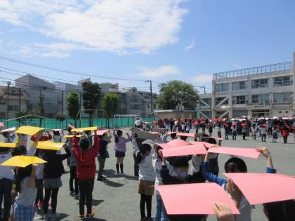 4月15日は、等々力小学校開校65周年記念の一環として、航空写真の撮影が行われました。全校児童と教職員で人文字を作りました。