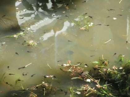 ビオトープの池では、おたまじゃくしが元気よく泳いでいます。その様子を毎日休み時間に子どもたちが観察し、成長を見守っています。