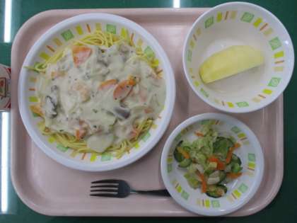 今日の給食は、スパゲティークリームソース、野菜のイタリアンドレッシングかけ、りんご、牛乳です。スパゲティークリームソースには、いかとえびが入っていて、魚貝のうまみがたっぷりです。