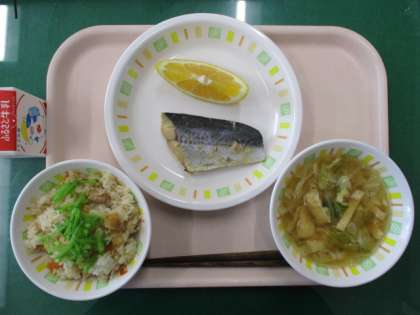 今日の給食は、たけのこごはん、鰆の西京焼き、春キャベツのみそ汁、河内晩柑です。今日は「旬を食べよう」の日です。今日はたけのこに鰆、みそ汁には春キャベツを使いました。たけのこは、朝からぬかととうがらしと一緒に下ゆでし、あく抜きをしました。おいしく食べてもらえたらうれしいです。