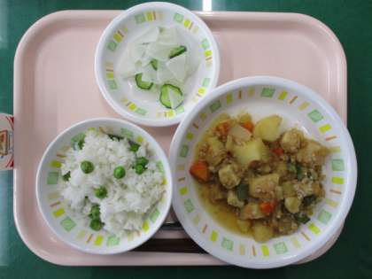 今日の給食は、グリーンピースごはん、新じゃがのそぼろ煮、大根ときゅうりの昆布茶あえ、牛乳です。今日は「旬を食べよう」の日です。旬のグリーンピースを、3年生にさやむきしてもらいました。冷凍や缶詰のグリーンピースよりも香りがよく、おいしくいただきました。
