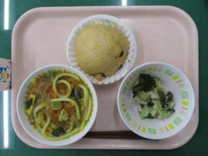 今日の給食は、カレーうどん、黒砂糖と甘納豆の蒸しパン、ツナのさっぱり和え、牛乳です。蒸しパンは、色々な具材を入れることでアレンジを楽しむことができます。今日の蒸しパンは、黒砂糖と甘納豆を入れました。やさしい甘さの蒸しパンは、牛乳との相性もばっちりです。