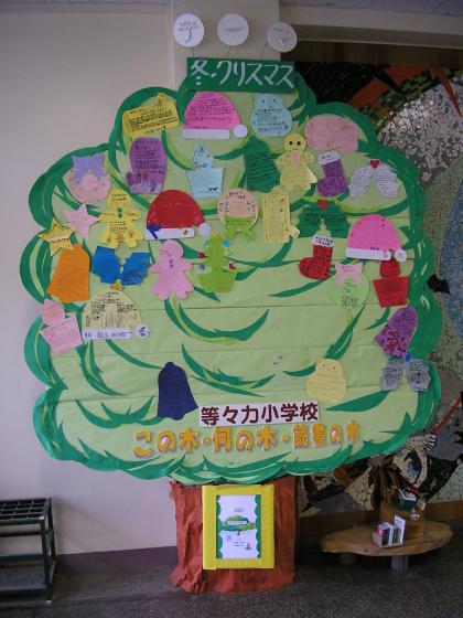 玄関入り口の「この木・何の木・読書の木」が新しくなりました。