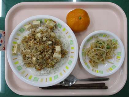 今日の給食は、麻婆豆腐丼、もやしのコチュジャンかけ、冷凍みかん、牛乳です。今日は気温も上がり、冷凍みかん日和です。1年生の中には、初めて見た子もいるようで、冷たいみかんに驚いている様子でした。