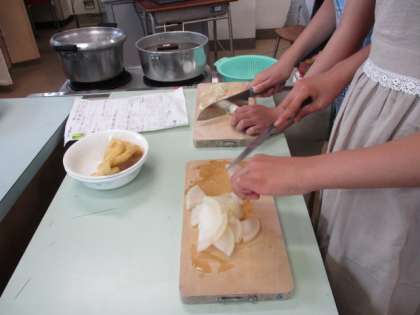 みそ汁の具材を切っています。具材は大根、油揚げ、ネギです。安全に包丁を扱えました。