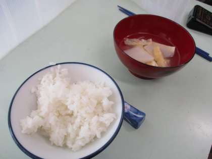 炊き上がったご飯と温かいみそ汁を盛り付けました。班で協力して、調理実習ができました。
