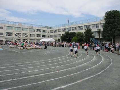 運動会の最初に登場したのは4年生です。短距離走では、スタートの仕方、腕をしっかりふること、ゴールまで走り抜けることを練習してきました。ゴール目指して全力で走りました。