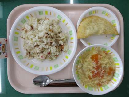 今日の給食は、梅じゃこチャーハン、ツナにらぎょうざ、卵とトマトのスープ、牛乳です。卵とトマトのスープには、湯むきをしたトマトをたっぷり入れました。トマトの酸味でさっぱりした味わいになり、夏にぴったりのスープです。
