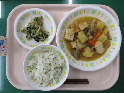 今日の給食は、菜めし、五目うま煮、野菜ののりあえ、牛乳です。今日は、七分付き米を使いました。七分付き米とは、玄米から「ぬか」と「胚芽」を7割取り除いたものです。精白米に比べ、食物繊維やビタミン、ミネラルが豊富に含まれています。玄米よりも食べやすく、言われなければいつものお米との違いに気がつきにくいかもしれません。