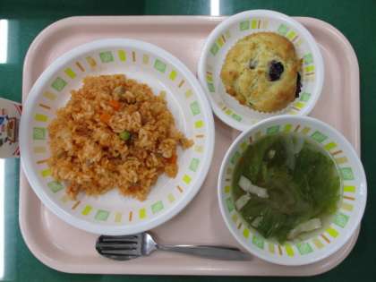今日の給食は、チキンライス、レタススープ、ブルーベリーカップケーキ、牛乳です。ブルーベリーカップケーキは、生のブルーベリーを、ケーキの生地に混ぜて焼きました。外国産のブルーベリーは一年中出回っていますが、日本では夏にしか収穫できません。甘酸っぱいブルーベリーは、ケーキやジャムによく合います。