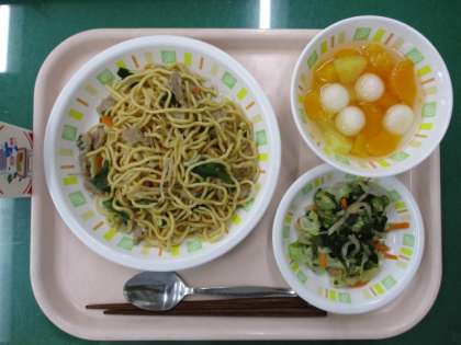 今日の給食は、塩焼きそば、わかめとキャベツのサラダ、フルーツ白玉です。塩焼きそばは、いつものソース焼きそばの味つけを変えただけでなく、ねぎやたけのこなどを入れ、具材も塩味に合うようにしています。ソース焼きそばと同じくらい、子どもにも人気のあるメニューです。