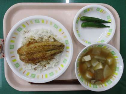 今日の給食は、いわしのかば焼き丼、おくらのおかかかけ、けんちん汁です。今日は「入梅」です。入梅とは「暦の上で決められた梅雨入り」のことです。実際の梅雨入りは、地域や年によって違いますが、昔はこの入梅の日を田植えの基準にしていました。この時期にとれるいわしを「入梅いわし」と呼び、1年のうちで1番おいしいと言われています。今日はそんないわしをかば焼きにしました。甘辛い味つけが人気のメニューです。