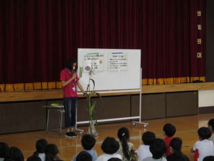 1年生は、7月6日(火)、とうもろこしのかわむきをしました。はじめに栄養士の先生から、とうもろこしのえだを見せていただきました。かわをむくときは、ひげをしっかりとることが大切だと教えていただきました。