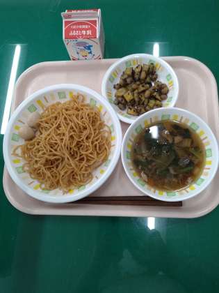 今日の献立は、ラーメン、うずら卵のしょうゆ煮、お豆かりんとう、牛乳です。お豆かりんとうは、大豆とさつまいもに砂糖をからめました。黒ごまの香ばしさも加わった一品です。