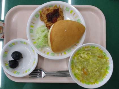 今日の献立は、チキンカツサンド、たまごスープ、ぶどう、牛乳です。紫色のぶどうは秋を感じさせる果物です。健康によいポリフェノールを含んでいます。