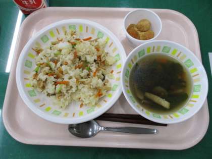 今日の給食は、五目ずし、里芋のすまし汁、月見団子、牛乳です。今日は十五夜です。十五夜は別名「芋名月」とも呼ばれます。この時期は、里芋の収穫が最盛期を迎えるため、このように呼ばれていました。今日は、里芋を使ったすまし汁に、白玉餅で月見団子を作りました。今日の夜は月が見えるでしょうか。たまにはゆっくり月を眺めてみるのもいいですね。