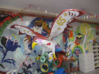 等々力小学校の開校65周年を記念して、PTA遊び場開放委員会とおやじの会が、マスコットキャラクターのデザインを子どもたちから募集し、投票を行い決定した、ドリームバードです。夏におやじの会の皆様がオブジェを作成してくれました。毎日、正面玄関で子どもたちを迎えてくれています。