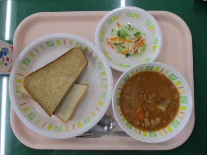 今日の給食は、二色サンド、ハンガリアンシチュー、フレンチサラダ、牛乳です。ハンガリアンシチューは、その名前の通り、ハンガリー風のシチューです。ハンガリー料理には、ピーマンやパプリカが多く使われています。昔の人は、ビタミンCが多いピーマンを食べて、栄養を補っていたそうです。今日のシチューにも、ピーマンとパプリカパウダーを入れて作りました。