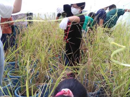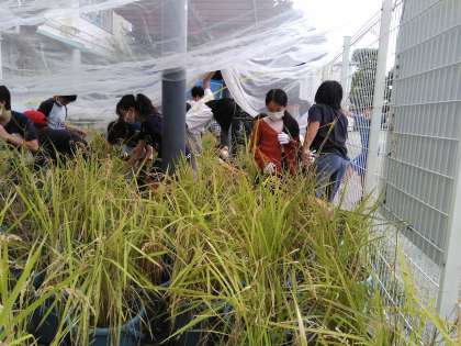 5月からバケツ稲の栽培を始めました。今日は、稲穂が頭を垂れ、お米が実ったので、稲刈りをしました。